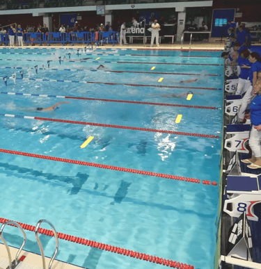 Sur une des vues du live vidéo, vous allez voir apparaitre dans chaque couloir, une ligne jaune représentant le temps d'engagement de la nageuse ou du nageur.
